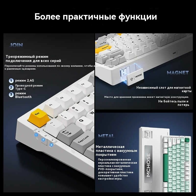 Трехрежимное подключение, универсальное для различных сценариев: три режима Bluetooth, беспроводной и проводной связи, которые можно свободно переключать для удовлетворения различных потребностей.