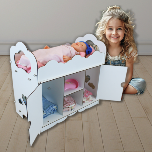 Деревянная мебель из ХДФ материала обеспечивает легкость и надежность конструкции. Кроватка со шкафом представляют собой не только большую игровую площадку для кукольных игр, но и удобное место для хранения множества игрушек и одежды. Все любимые куклы найдут здесь свой уютный уголок! Устойчивая конструкция гарантирует безопасность детей во время игры, а милый дизайн порадует глаз каждого ребенка.
