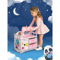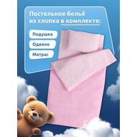 Кроватка оснащена пеленальным столиком, который включает постельное белье розового цвета из хлопка: уютный матрас, одеяло и мягкую подушку. Это позволяет вашему малышу уложить своих куколок спать комфортно и аккуратно.