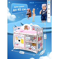 Кроватка оборудована шкафом-ящиком с двумя дверьми для одежды и вещей куклы. На двух просторных полках можно расположить различные аксессуары для кукол или набор корзинок для хранения.