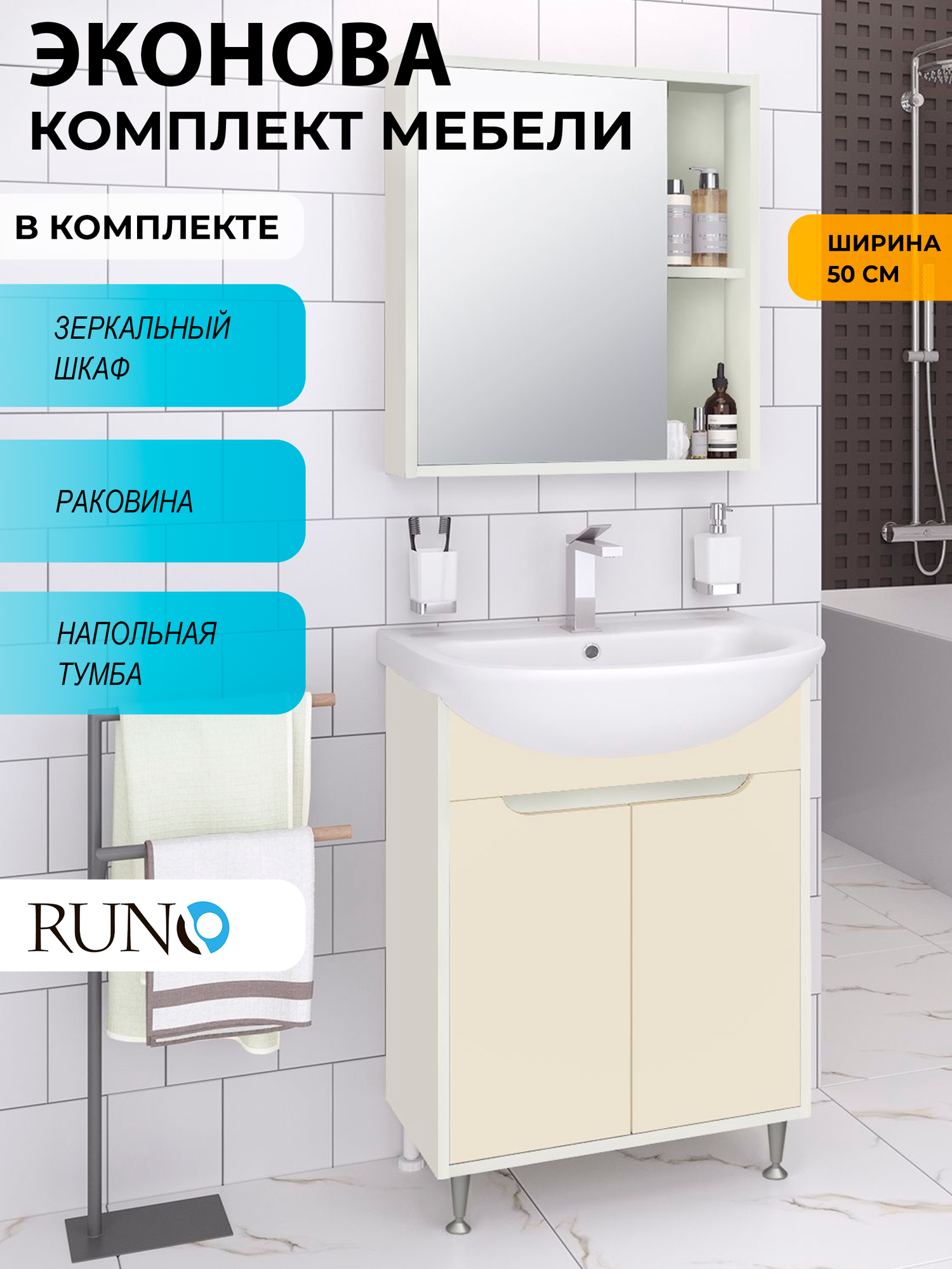 Мебель для ванной Runo ЭкоНова 50, белый-кремовый, тумба с раковиной Уют 50, шкаф-зеркало: сравнение цен, характеристики, фото, актуальное наличие и цены.
