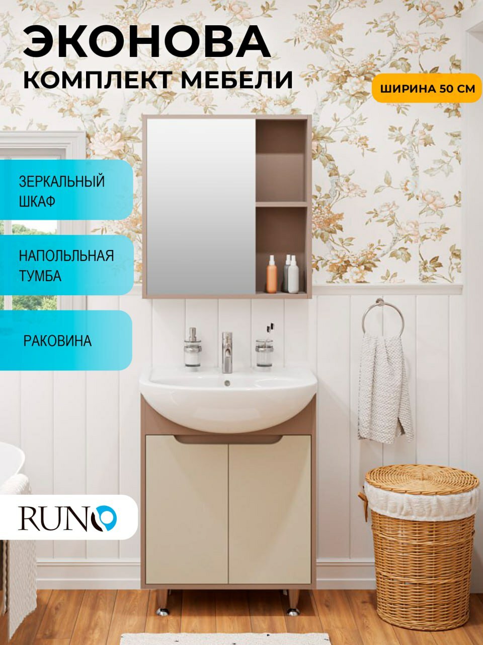 Мебель для ванной Runo ЭкоНова 50, какао-бежевый, тумба с раковиной Уют 50, шкаф-зеркало: сравнение цен, характеристики, фото, актуальное наличие и цены.