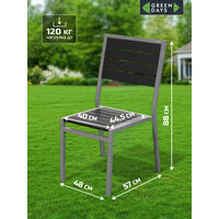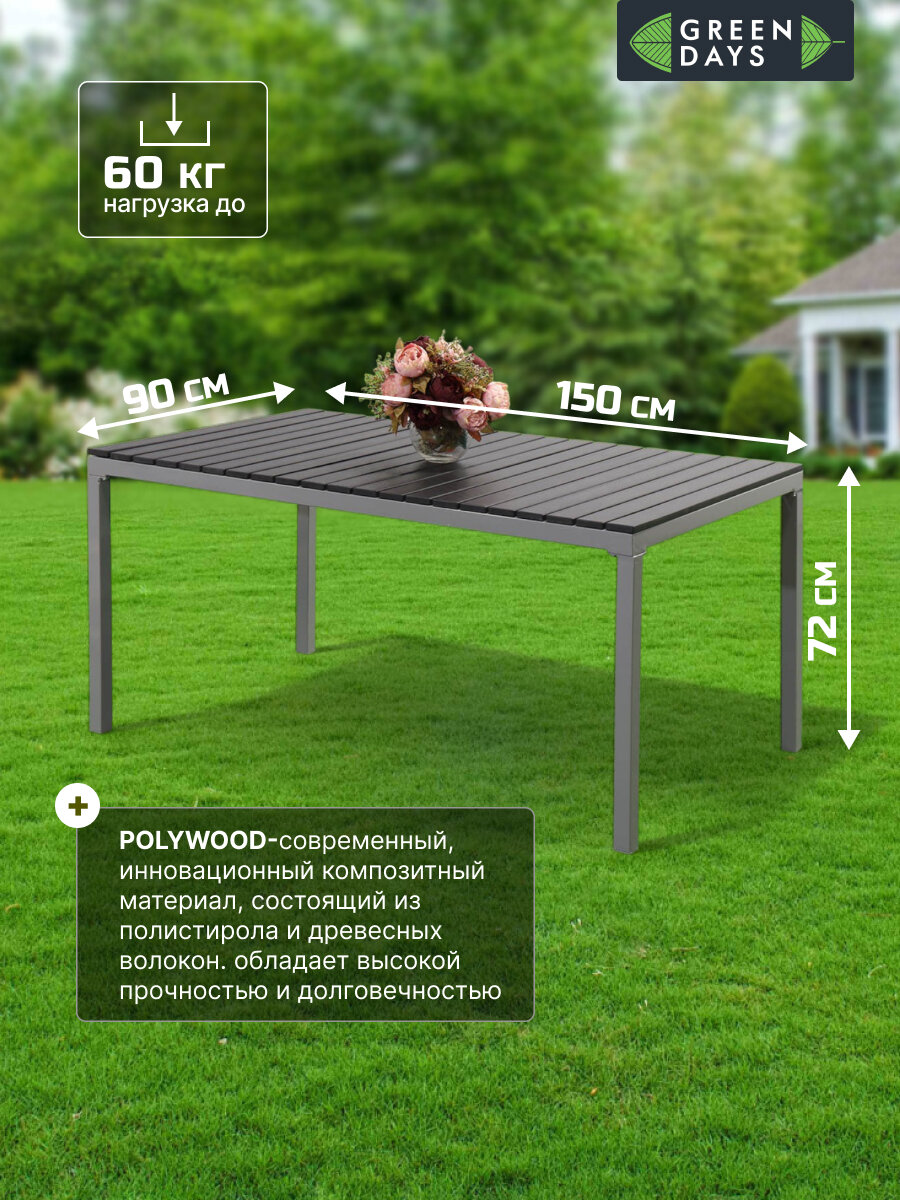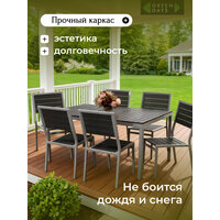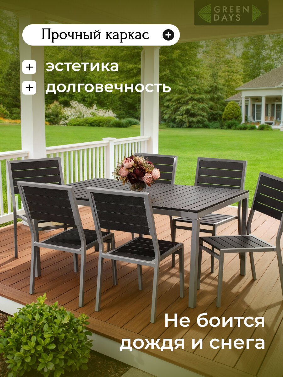 Создайте уютную атмосферу с изысканным комплектом садовой мебели от бренда Green Days серии "Эвелина". Садовая мебель создана, чтобы преобразить ваш участок, это идеальный выбор для дачи и сада. Набор мебели для 6-ти персон включает в себя всё необходимое для комфортного отдыха на природе. Товары для сада и дачи Грин Дейс из пластика и металла отличаются легкостью и прочностью, что делает их универсальными. Комплект мебели позволяет организовать стильное пространство не только дома, но и создать впечатляющее место отдыха возле гриля или барбекю. Стул из металла и пластика создан в современном стиле с каркасом из металла удобной формы. Эти стулья идеально подходят как для отдыха у бассейна дома, так и на веранде. Высокая спинка обеспечивает дополнительный комфорт во время длительных посиделок и способствует расслаблению мышц. Добиться уютной атмосферы поможет большой стол. Обеденный стол отлично подходит для чаепития или пикника на свежем воздухе благодаря надежной столешнице прямоугольной формы материала Polywood и устойчивым ножкам из металла. Габариты комплекта и максимальная нагрузка: Размер стола (ДхШхВ): 150х90х72 см; нагрузка 60 кг; Размер стула (ДхШхВ): 59х57х57 см; нагрузка 120кг. Каркас мебели бренда Грин Дейс изготовлен из прочного металла, а столешница и сиденье из материала Polywood, способного выдерживать высокие весовые и другие механические нагрузки без риска деформации и расшатывания.