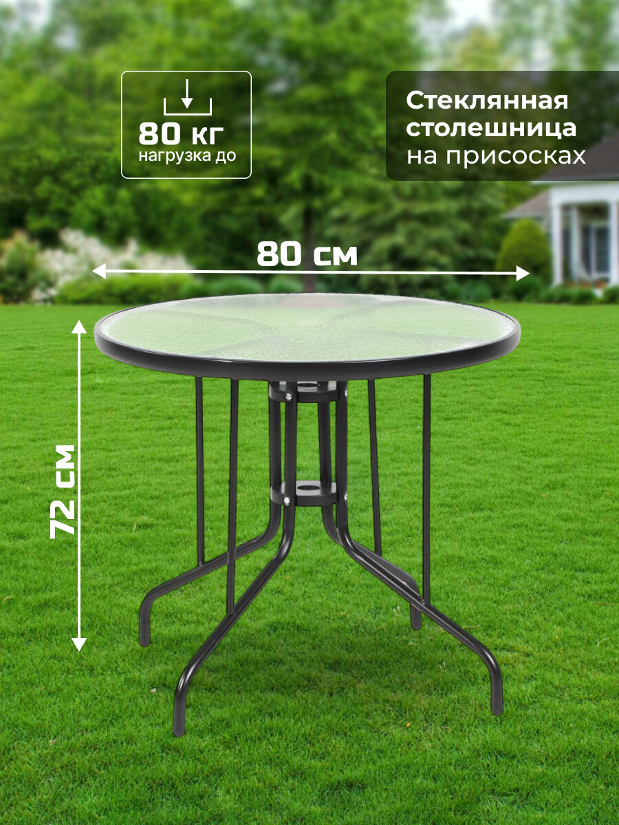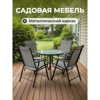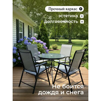 Создайте уютную атмосферу с изысканным комплектом садовой мебели Таллин. Этот комплект мебели — идеальный выбор для дачи и сада, который преобразит ваш участок и станет отличным местом для отдыха на природе. Набор металлической мебели для четверых персон включает всё необходимое для комфортного времяпрепровождения. Товары из металла отличаются лёгкостью и прочностью, что делает их универсальными. Такой комплект позволит оформить стильное пространство не только на участке у дома, но и возле гриля или барбекю. Стулья выполнены в современном стиле: имеют удобную форму, каркас из прочного металла и мягкое текстильное сиденье. Они идеально подойдут для отдыха у бассейна, на веранде или в саду. Высокая спинка обеспечивает дополнительный комфорт даже при длительных посиделках. Сделать атмосферу ещё более уютной поможет компактный стеклянный столик. Он отлично подходит для чаепития или пикника на свежем воздухе. Круглая столешница из стекла и устойчивые металлические ножки гарантируют надежность и долговечность. Габариты: Стул: 58х65х93 см. Количество: 4 шт. Складная конструкция: да. Стол: 80х80х72 см. Каркас мебели изготовлен из прочного металла, который легко выдерживает высокие весовые и другие механические нагрузки, исключая риск деформации и расшатывания. Набор садовой мебели устойчив к погодным условиям, не боится влаги и загрязнений, а уход за ним не требует лишних усилий.