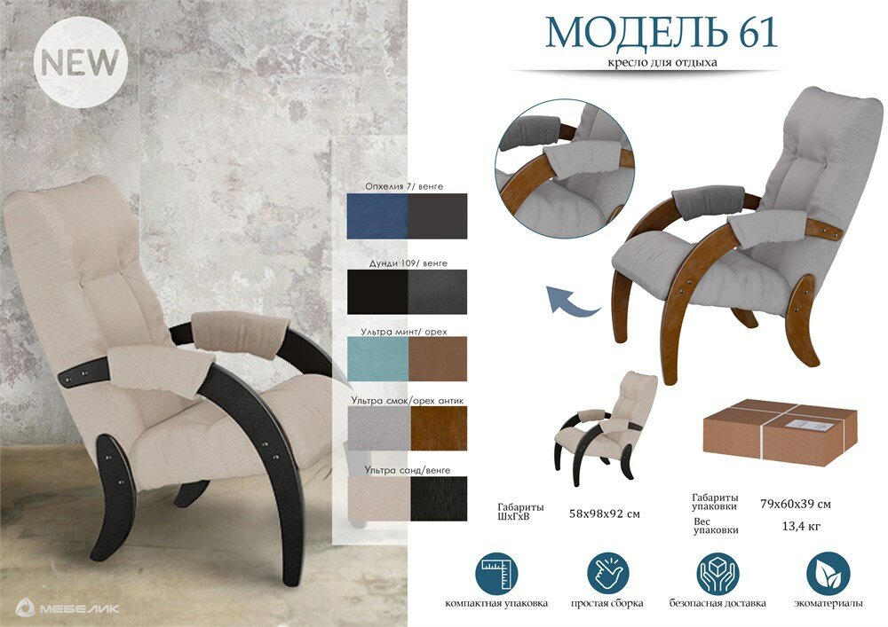 Мебелик Кресло для отдыха Модель 61 Ткань ультра минт, каркас орех ультра минт, орех: сравнение цен, характеристики, фото, актуальное наличие и цены.