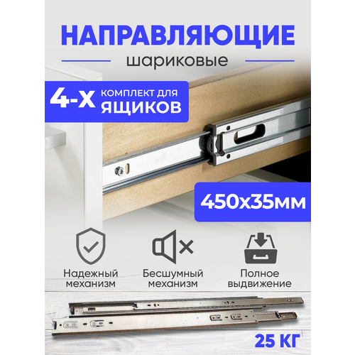 Основной и повсеместно используемый функциональный мебельный элемент-это выдвижной ящик. Мы любим ящик потому что он экономит пространство помещения, когда нет необходимости, он задвинут, и обеспечивает защиту содержимого от пыли и грязи. Как известно, ящик выдвигается и задвигается с помощью металлических направляющих, которые устанавливаются с правой и с левой стороны. Они предназначены, чтобы обеспечить довольно быстрый доступ к содержимому ящика шкафа, стола или комода. Мы предлагаем вам металлические шариковые направляющие. Эта разновидность мебельной фурнитуры для одного ящика представляет собой комплект из правого и левого подвижного механизма (одна металлическая пластина вставлена в другую) и пластины, которая монтируется на боковую поверхность стенки мебели. Нагрузка, которую выдерживает механизм довольно большая, до 25 кг. Длительная эксплуатация обеспечивается надежность материала из которого изготовлены полозки. Эта крепкая фурнитура обеспечивает плавное и легкое закрывание и открывание ящиков шкафов, а так же надежно фиксирует ящик в закрытом состоянии. Кроме того они работают бесшумно при полном выдвижении. Хорошая устойчивость ящика обеспечивается тем, что в механизме есть шарик, который работает как подшипник. Наши направляющие легко установить самостоятельно, в наборе есть все необходимое чтобы вы могли сделать монтаж сами. Фурнитура для мебели направляющие длиной 450 мм. и высотой 35 мм, комплект поставки для четырех ящиков. Такие типы мебели, как шкаф, кухонный гарнитур, деревянный комод для хранения вещей везде можно использовать механизм выдвижения ящиков. Мы предлагаем вам самые лучшие решения для организации хранения вещей дома, на даче и офисе. Преимущества мебельной фурнитуры с шариковыми направляющими полного выдвижения очевидны. Она позволяет создать удобное и практичное пространство, которое будет радовать вас каждый день. Кроме того, она обладает высокой прочностью и надежностью, что гарантирует ее долговечность и удобство в использовании. Товары нашего магазина обязательно порадуют вас отменным качеством и эстетичным внешним видом!