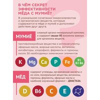 Алтайский мед с мумие помогает улучшить качество жизни в любом возрасте, избавиться от хронических болезней, укрепить иммунитет и повысить работоспособность. Больше информации вы можете наглядно увидеть в слайдах-картинках в этой карточке. Наш продукт поможет вам при болезнях желудка и при проблемах пищеварения. Подходит всем и наиболее полезен при болях и воспалении в суставах и мышцах, нервных расстройствах, проблемах с сердцем и сосудами, переломах и ушибах, проблемах с обменом веществ. Мед с мумие это легендарное исцеляющее снадобье, известность как сласть, продлевающая жизнь! В наши дни мумиё переживает своё второе рождение. Современная медицина уже обратила внимание на его полезные свойства — это уникальное природное вещество помогает бороться с патогенной микрофлорой, вирусами и грибками. Мумиё благотворно действует на весь организм в целом: способствует повышению сопротивляемости иммунитета к различным заболеваниям, помогает стимулировать процесс регенерации, что позволяет сократить период срастания костной ткани, способствует заживлению ран, положительно влияет на желудочно-кишечный тракт. Мёд с мумиё будет полезен тем, кому необходимо повысить выносливость и укрепить иммунитет, нормализовать флору кишечника и обмен веществ. Также, мёд с мумие можно использовать наружно при суставных болях и переломах. Травы и цветы, растущие в самом экологически чистом месте России — на Алтае — делают наш мёд уникальным как по вкусу, так и по содержанию полезных веществ. Его сочетание с мумиё увеличивает ценность этих двух самобытных алтайских продуктов в разы! В чистом виде мумиё не очень приятно на вкус, но в сочетании с мёдом, оно становится настоящим деликатесом, придавая мёду слегка горьковатый глубокий вкус, чем-то похожий на гречишный. Действие продукта зависит от регулярного употребления, а эффект раскрывается по мере насыщения организма полезными веществами. 1 банка 350 грамм рассчитана на двухнедельный прием на 1 человека. Для полного курса оздоровления рекомендуем приобрести 6 банок. Как принимать мёд с мумиё, чтобы получить максимальный результат? Всё просто - принимать нужно по одной чайной ложке три раза в день после еды. Одна чайная ложка три раза в день - это минимальная рекомендованная дозировка, которой необходимо придерживаться для получения результата. Желаем вам крепкого здоровья!