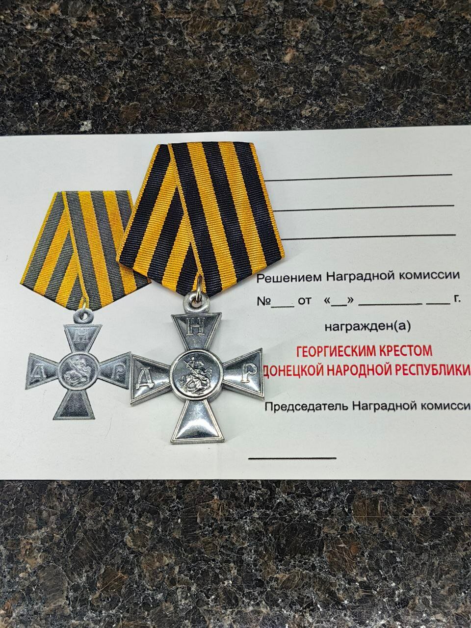 - Георгиевский крест - награда, учрежденная в Российской империи для нижних чинов в армии. В Российской Федерации этот знак отличия и его статут были восстановлены в 90-х годах XX века. В Новороссии в условиях военного времени также были учреждены новые награды, среди которых и Георгиевский крест.