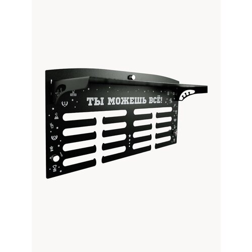 Медальница с полкой Лайт "Ты можешь всё!" от компании "На Победе" - это результат многолетней работы над совершенствованием систем хранения наград. Бескомпромиссное качество нашей продукции подтверждено тысячами отзывов наших довольных покупателей. Мы используем самый качественный металл, профессиональные металлические дистанционные держатели и стильную упаковку. Никаких дешевых картонок для упаковки, деревянных чопиков для отрыва от стены и других составляющих гаражных поделок! Мы ценим наших покупателей и предлагаем продукт, продуманный до мелочей нашими инженерами-конструкторами и дизайнерами для удобного, стильного и безопасного размещения завоёванных вами трофеев и изготовленный в промышленных условиях с соблюдением всех норм и требований к изделию. Наш оригинальный держатель для медалей обладает стильным дизайном, великолепно вписывается в любой интерьер и призван вдохновлять на новые победы и достижения на спортивном Олимпе! Данная модель позволяет гармонично разместить более 50-60 медалей на классических лентах. Полка выдерживает достаточное количество кубков и статуэток. Толщина металла 1.2 мм и отсутствие загиба у полки создаёт впечатление парящих кубков, сама полка не оттягивает на себя акцент, направляя всё внимание завоеванным наградам. С недавних пор наши инженеры добавили новый функционал – теперь дипломы и грамоты можно хранить между стеной и медальницей, удерживать бланки призваны дистанционные держатели: два сверху по бокам и один по центру в нижней части медальницы. На металлической медальнице очень удобно размещать магниты, привезённые на память с соревнований из других городов и стран. Слева и справа на полке есть технологические вырезы, на которых можно разместить вымпелы. Мы изготавливаем медальницы из металла в промышленных условиях и занимаемся этим уже более 16 лет! Покрытие медальницы - полимерная порошковая окраска, сохраняющая презентабельный вид весь срок эксплуатации и абсолютно безопасная для здоровья. Изображение нанесено при помощи ультрафиолетовой печати, оно не стирается и не выгорает со временем. Спортивная медальница от компании "На Победе" - желанный подарок для любого спортсмена - мужчины или женщины. Держатель для медалей станет великолепным подарком к любому празднику или мероприятию, будь то день рождения, юбилей, 8 марта, 23 февраля, новый год и рождество, а так же ценным подарком на спортивных мероприятиях. Оригинальные медальницы от компании "На Победе" поставляются в красивой коробке-чемодане с ручкой и не требуют дополнительной упаковки. Весь набор креплений и дистанционных держателей уже входит в комплектацию, докупать ничего не потребуется. Ваш чемпион будет доволен! Ширина медальницы - 40 см, высота - 20 см, глубина полки для кубков - 12 см, ширина полки для кубков – 38 см.