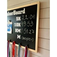 Многофункциональная медальница для бегуна с зажимом для номеров. Все спортивные трофеи в одном месте! Ставьте перед собой цели или записывайте новые личные рекорды на популярных шоссейных дистанциях. Меловая доска размером 45х60 см в деревянной рамке вместила в себя 5 крючков для медалей, 2 зажима для номеров и место для записи Ваших результатов. Медальница бег пригодится как для профессионального легкоатлета, так и для бегуна-любителя, участника массовых забегов. Крепится к стене на 2 крепления, крючки выдержат большое количество медалей. Лаконичный и строгий дизайн подойдет в любой интерьер. Мотивирующие записи будут создавать настрой в межсезонье на дальнейшую борьбу на дистанции. Ни один гость не пройдет мимо Ваших рекордов и наград, предвкушайте вопросы о забегах и готовьте увлекательные истории о преодолении себя! Мел и меловой маркер в комплект не входит. Рекомендуется стирать надписи сухой губкой или микрофиброй без специальных средств. Это отличный подарок бегуну или легкоатлету.
