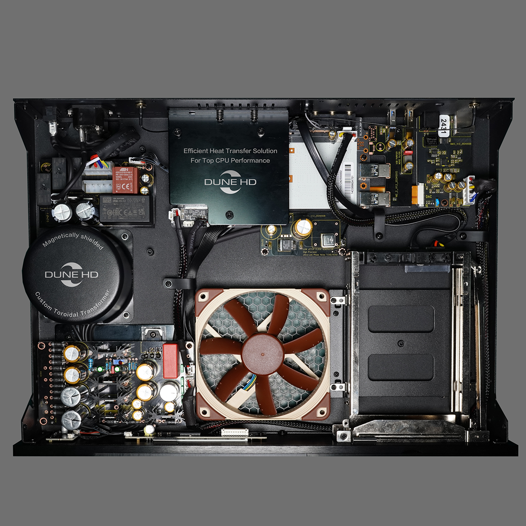 Dune HD Max 8K - Полноразмерный премиальный 8K медиаплеер на новейшем процессоре Amlogic S928X-K/J с поддержкой Dolby Vision и HDR10+. Отсек для 3.5" HDD на виброизолированном шасси, память 8+64 ГБ, Wi-Fi 6, линейный блок питания, тактовый генератор TCXO для максимального качества сигнала на всех выходах, Hi-Fi цифровой аудиовыход на базе чипа XMOS.