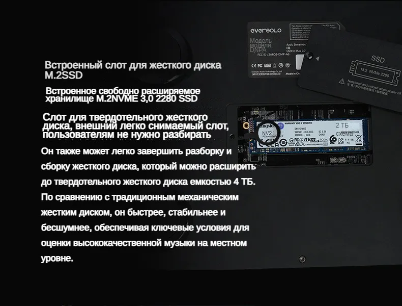 Локальное воспроизведение музыки: поддержка через M.2 Разъема для твердотельных накопителей SSD NVME 3.0 2280 (поддерживает объем до 4 ТБ) для хранения музыкальных файлов и их локального воспроизведения.