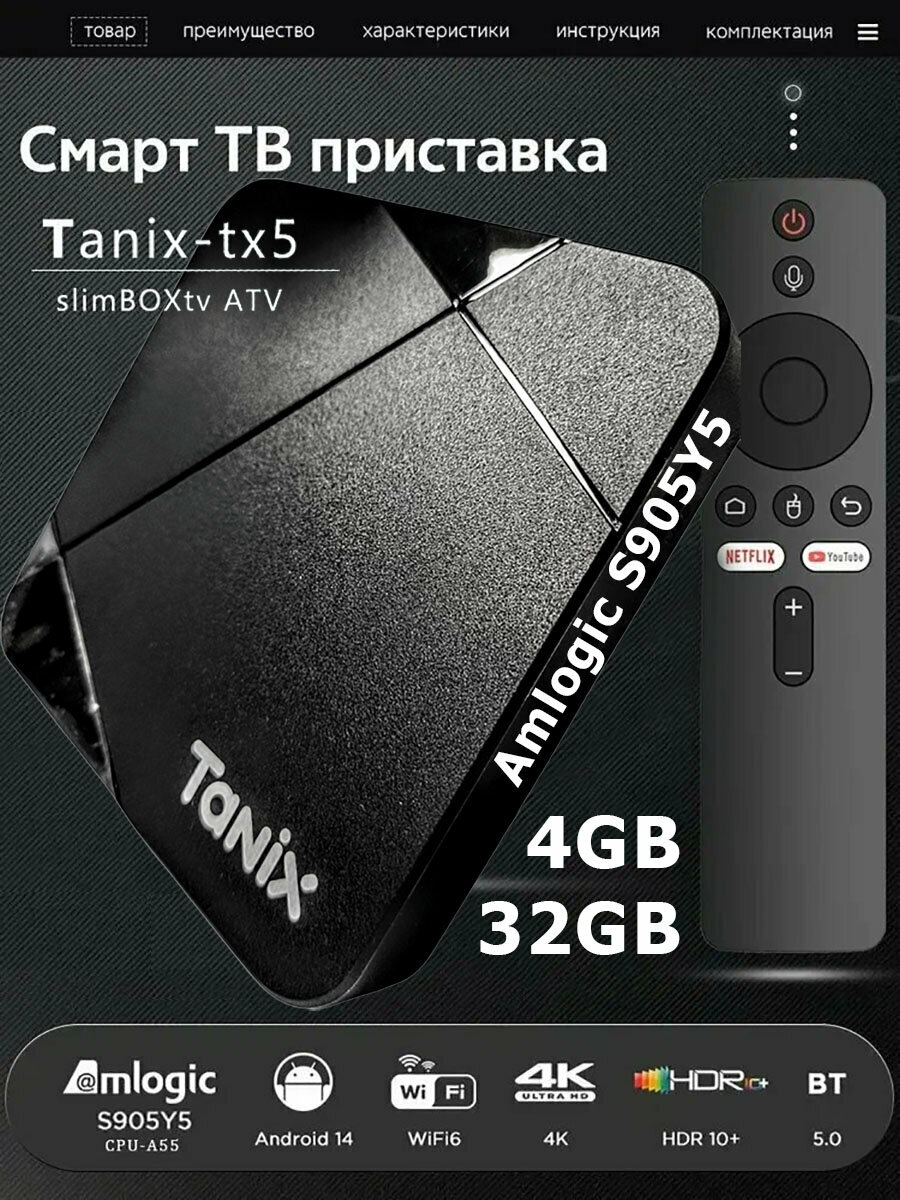 Медиаплеер Tanix TX5 4/32 ГБ S905Y5 smart TV приставка для караоке-системы Android 14: сравнение цен, характеристики, фото, актуальное наличие и цены.