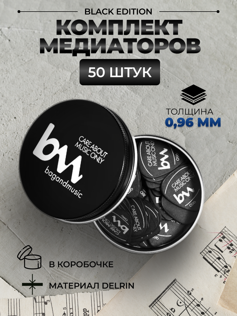 Набор медиаторов bm 50штук толщиной 0,96 (Ограниченная серия в черном цвете!) изготовлены из высококачественного материала DELRIN, который обладает особой прочностью, обеспечивает надежный захват и удобство во время игры на гитаре. На поверхности медиаторов bagandmusic есть микронапыление для лучшего контакта с пальцами, медиаторы не скользят, что позволяет музыканту свободно и точно играть. Удобны для игры на электро и бас - гитаре. Благодаря прочности материала, они долго не истираются и сохраняют свою форму. Кроме того, медиаторы имеют приятную на ощупь поверхность, что делает игру на гитаре ещё более комфортной и приятной. Независимо от уровня мастерства, эти медиаторы являются надежным инструментом для музыкантов и позволяют полностью раскрыть потенциал каждой ноты. Все медиаторы BAG&music поставляются в фирменной коробке, что гарантирует их сохранность при транспортировке. В этой коробочке удобно и красиво хранить ваши медиаторы в чехле для гитары. В дальнейшем вы можете докупать дополнительно наши фирменные медиаторы в комплектах по 6шт. без фирменной коробочки. Идеально подходят для подарка гитаристу.