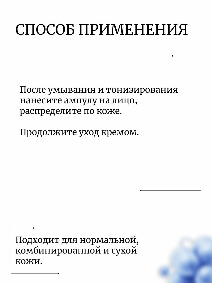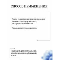 | Способ применения | На очищенную и тонизированную кожу несколько капель сыворотки и распределите лёгкими похлопывающими движениями до полного впитывания. |
