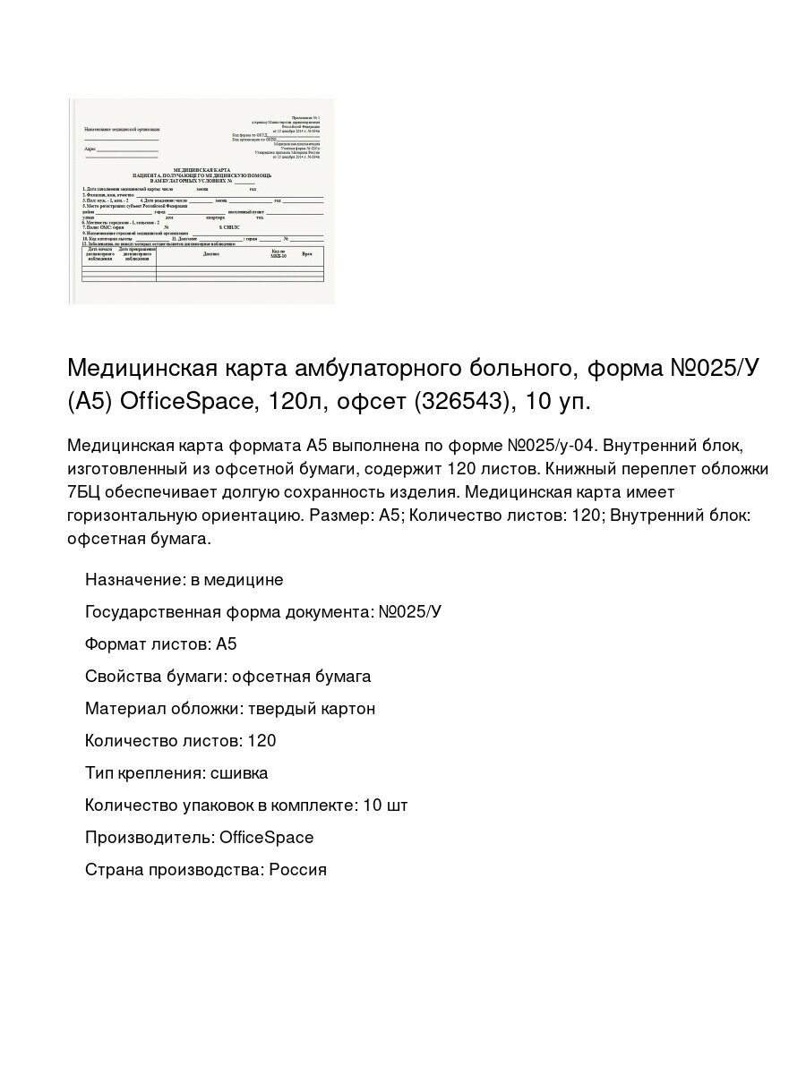 Медицинская карта амбулаторного больного, форма №025/У (А5) OfficeSpace, 120л, офсет (326543), 10 уп.: сравнение цен, характеристики, фото, актуальное наличие и цены.
