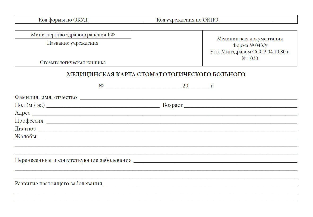 Медицинская карта стоматологического больного (Форма 043/у), упаковка 100 шт.: сравнение цен, характеристики, фото, актуальное наличие и цены.