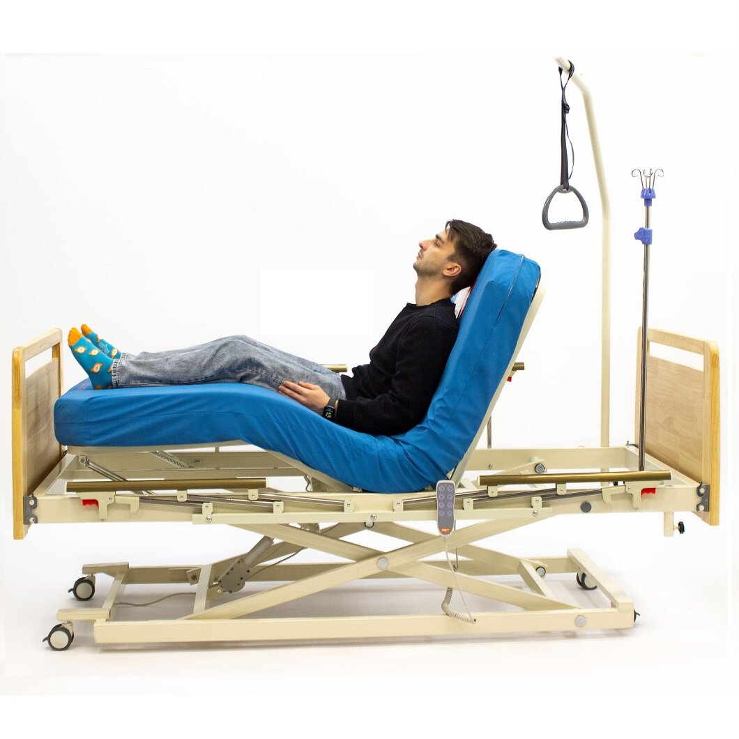 Высота ложа регулируется при помощи электропривода в диапазоне от 18 до 50 см. Возможность опустить ложе до уровня пола делает безопасным нахождение в кровати пожилых людей, людей страдающих деменцией или с нарушениями ориентации в пространстве. А возможность поднять ложе на комфортную для ухаживающего высоту облегчает уход и сохраняет здоровье ухаживающему.