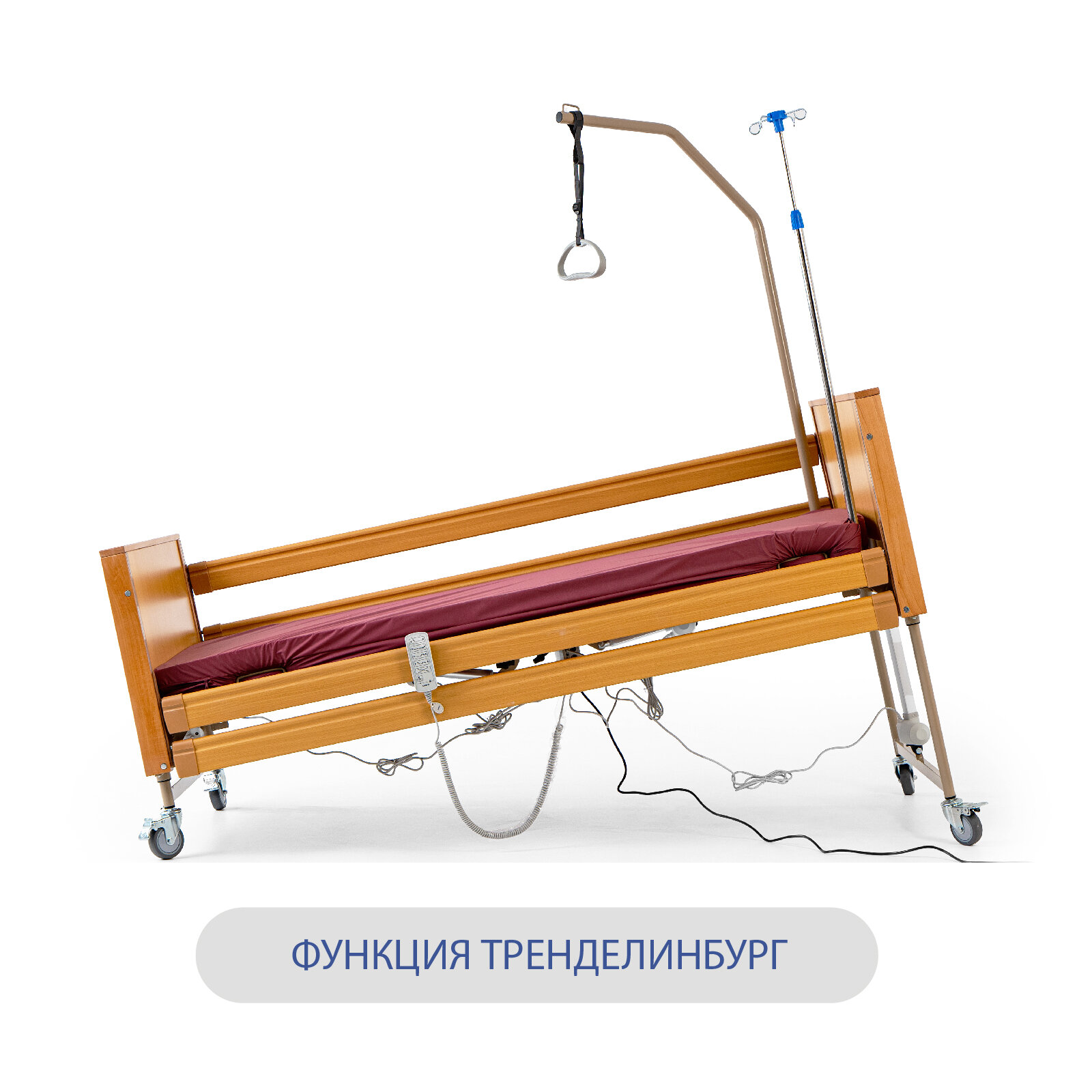 четырехсекционная , электрическая с пультом , регулировка высоты ложа, спинной секции, бедренной секции, тренделенбург, антитренделенбург, с опускающимися ограждениями, с матрасом