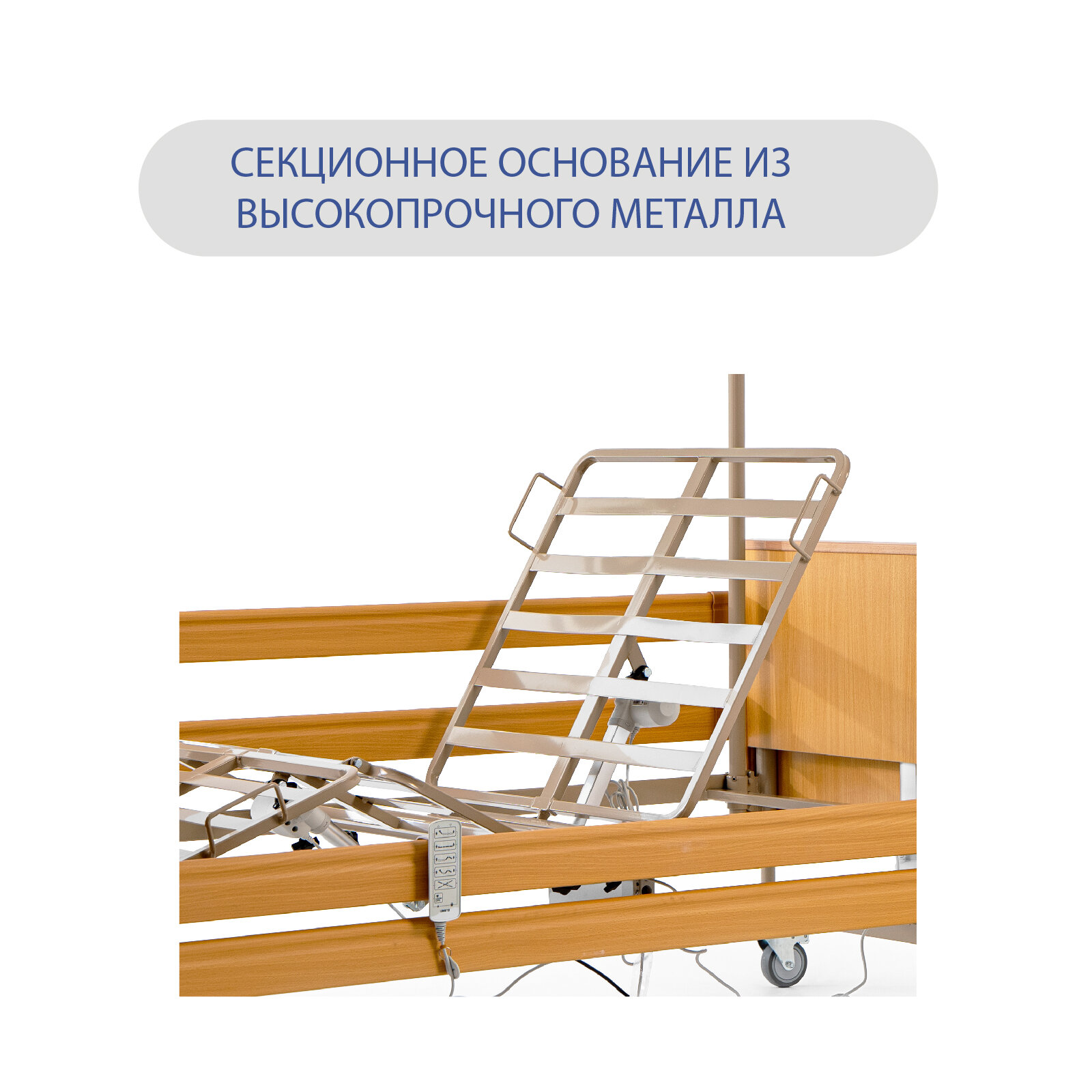 Медицинская четырех секционная функциональная кровать для лежачих больных Luna от фирмы Vermeiren предназначена для ухода за людьми с ограниченными возможностями, как в домашних условиях так и в условиях стационара. Медицинская кровать практична и удобна в обращении. При помощи регулировок достигается наиболее комфортное положение пользователя для отдыха и сна. Ложе кровати состоит из 4х секций с металлическими ламелями, регулируется по высоте. Спинки и ограждения электрической кровати изготовлены из дерева, четырех секционное основание - из высокопрочного металла, а эстетичный вид изделия не нарушит интерьера квартиры, что позволяет использовать медицинскую кровать в домашних условиях. Плавные регулировки секций и высоты многофункциональной кровати достигаются за счет использования надежных электроприводов компании Linak. Управление функционалом осуществляется с помощью пульта дистанционного управления, что дает возможность больному самостоятельно регулировать положение кровати. Изделие поставляется в сложенном виде. В течение нескольких минут Вы сможете установить медицинскую кровать в любое удобное место. Боковые ограждения регулируются по высоте и опускаются ниже уровня основания, что облегчает комфортное сидение пациента на кровати. Колеса, установленные на кровать, оснащены тормозами с индивидуальной блокировкой. Головная и бедренная секция регулируются по углу наклона от пульта дистанционного управления, ножная секция вручную. В электрической кровати предусмотрена функция тренделенбурга/антитренделенбурга, то есть регулировка ложа по углу наклона. В наличии функция CPR. Для удобства пациента в комплектацию многофункциональной кровати включены дуга для подтягивания, которое позволяет пользователю двигаться и менять положение тела, инфузионная стойка для капельниц, матрас в грязезащитном чехле. Максимальная грузоподъемность кровати 175 кг. Максимальная нагрузка на штангу 80 кг. внимание! Сборку осуществлять только после ознакомления с инструкцией!