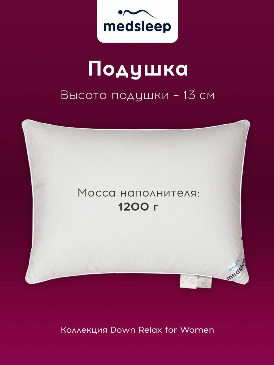 Medsleep Подушка для сна «Down Relax for Women» с натуральным 100% гусиным пухом-пером 1600 грамм, 50х70: сравнение цен, характеристики, фото, актуальное наличие и цены.