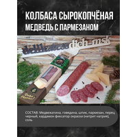 Представляем вашему вниманию уникальную колбасу из медведя с добавлением изысканного пармезана. Этот продукт полностью создан на нашем собственном производстве из натуральных ингредиентов высочайшего качества. Каждый кусочек этой колбасы пропитан интенсивным вкусом и ароматом, который вас покорит. Наша колбаса из медведя с пармезаном - это не просто продукт, это настоящее готовое блюдо, которое станет украшением любого стола и придется по вкусу самым изысканным гурманам. Идеально подходит для закуски, ужина или как вариант к столу на праздник. Упаковка этой колбасы выполнена в виде стильного тубуса, что делает ее идеальным вариантом для подарка. Порадуйте своих друзей или близких этим изысканным лакомством и подарите им настоящий кулинарный шедевр. Откройте для себя мир наслаждения и гастрономических открытий с нашей колбасой из медведя с пармезаном. Погрузитесь в удивительный мир вкусов и наслаждайтесь каждым кусочком этого прекрасного продукта. Попробуйте и почувствуйте магию этой колбасы прямо сейчас. Не упустите возможность удивить себя и ваших близких этим роскошным подарком!