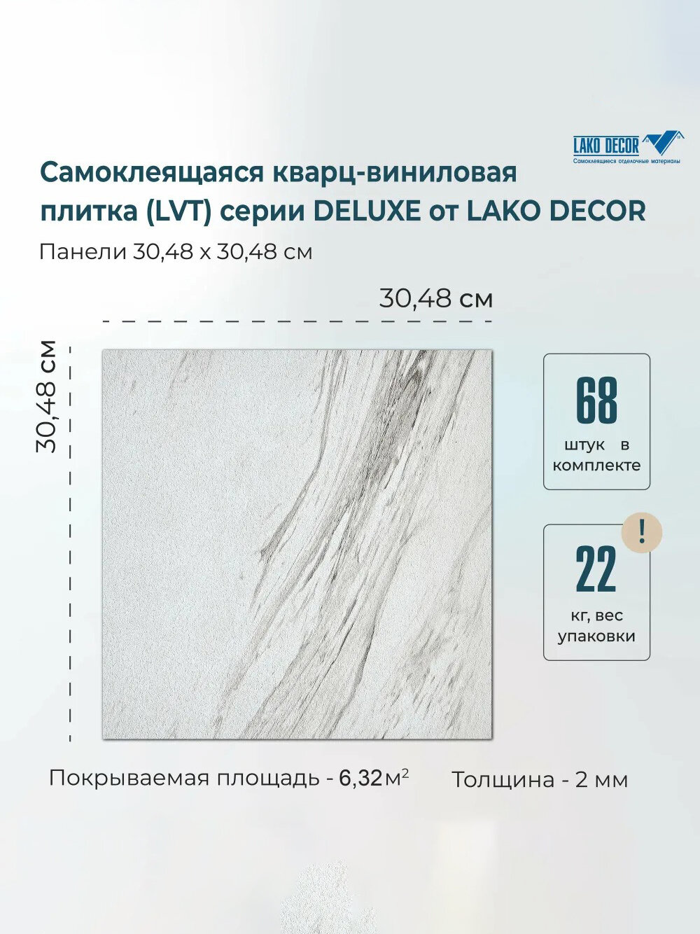 | Дополнительная информация | Мега-Комплект LVT плитки 68шт., 6,3 м2; при монтаже на стены использовать жидкие гвозди. |