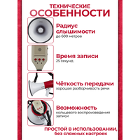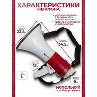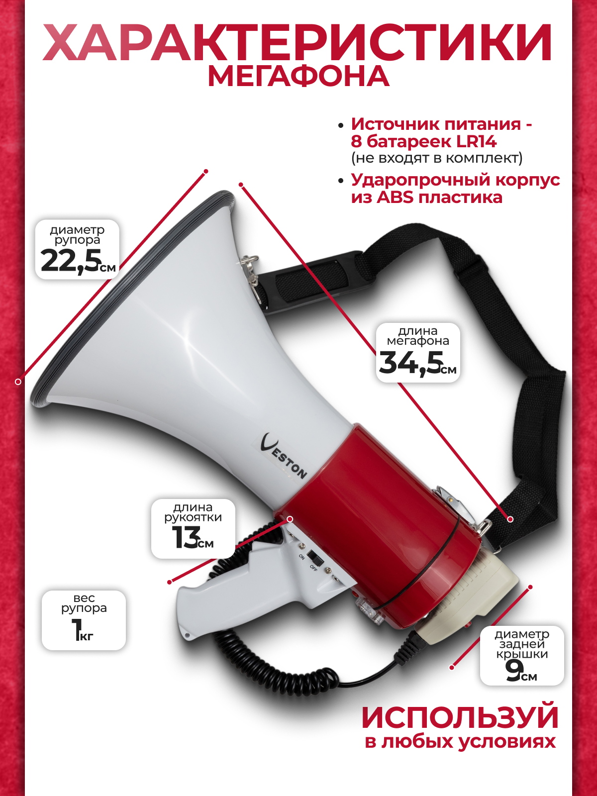 Технические характеристики: Модель VESTON VMEG-8; Мощность 8 Вт; Дальность распространения звука 200 м; Диаметр рупора 135 мм; Источник питания 4 батарейки 14A, LR14, Size C (не входят в комплект). Доп. функции сигнал "сирена". Купить мегафон можно для различных целей, даже бытовых, ведь его презназначение - чтобы Вас услышали на расстоянии или на шумном мероприятии. Ручной мегафон - незаменимый помощник в торговле, проведении рекламных акций, спортивных мероприятий, фестивалей или концертов, публичных выступлений и при проведении массовых мероприятий и собраний, школьных линеек. Для обеспечения безопасности на пляжах и открытых площадках в парках. Ни один экскурсовод не обходится без этого чуда техники!