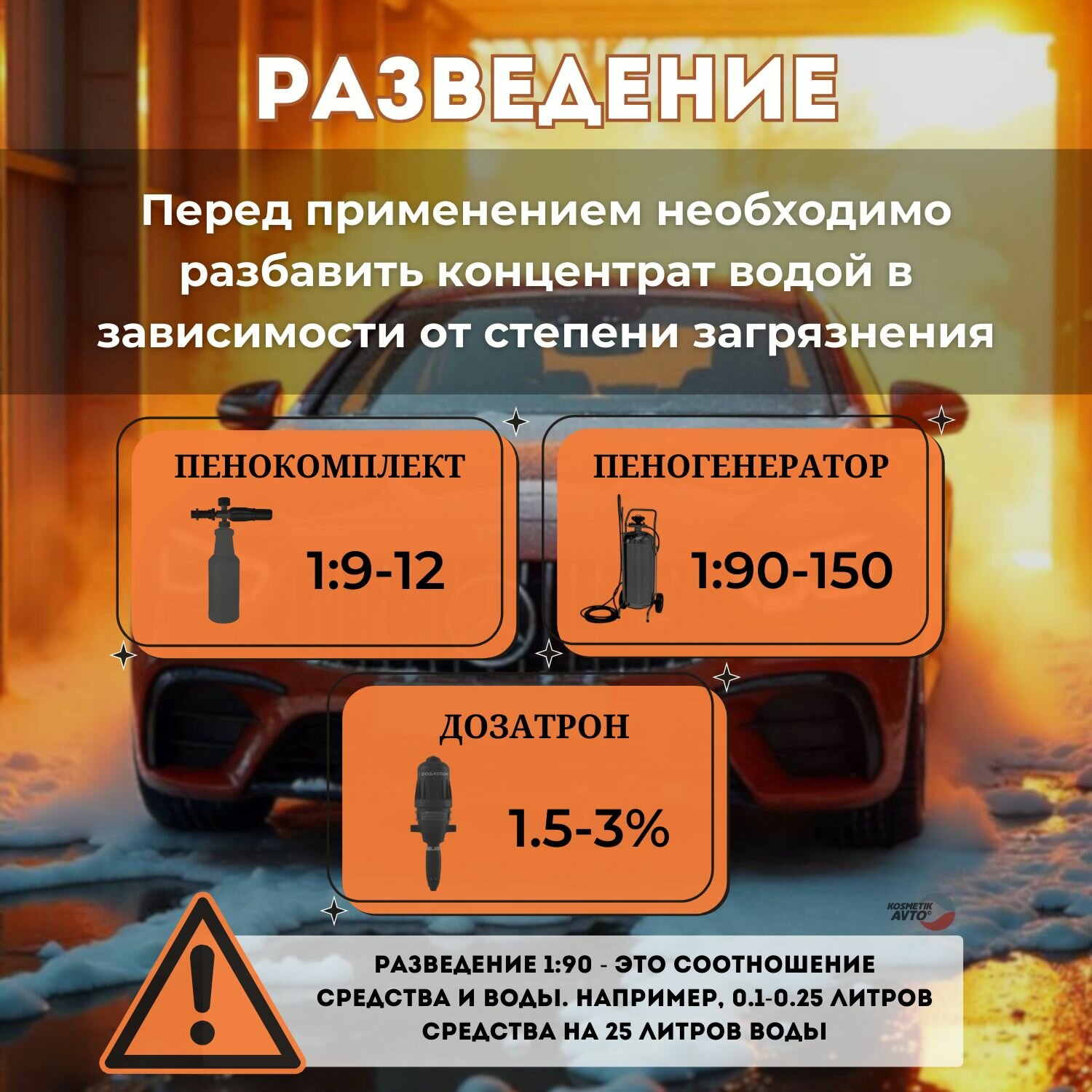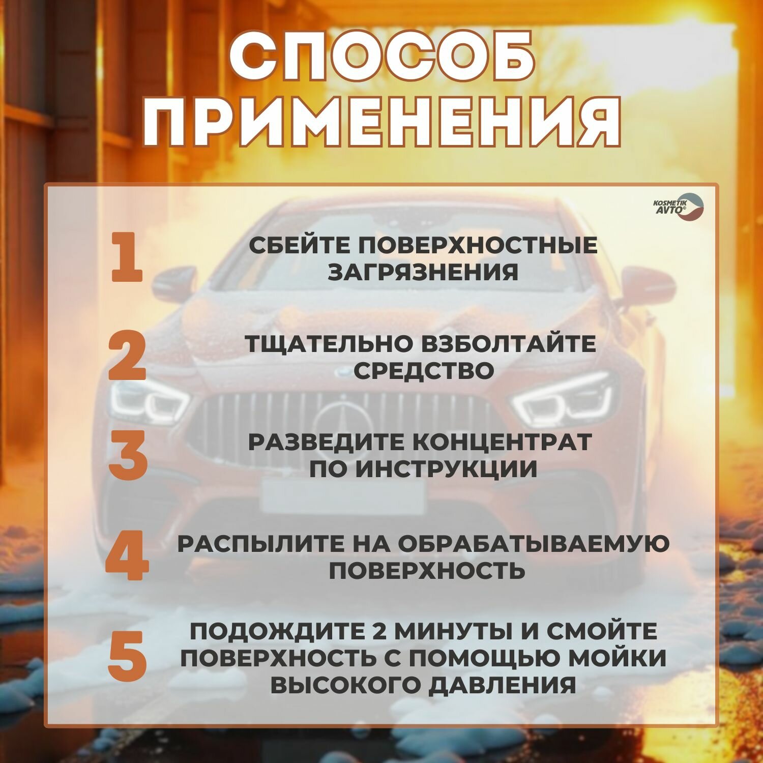 Приготовить рабочий состав разбавив с водой. Для пенокомплекта 1:4 - 1:5, для пеногенератора 1:100, в системах дозирования (дозатрон) 1,5-3% в зависимости от степени загрязнения и жесткости воды. После нанесения рабочего состава на кузов автомобиля выждать 2-3 минуты и смыть под высоким давлением при помощи АВД.