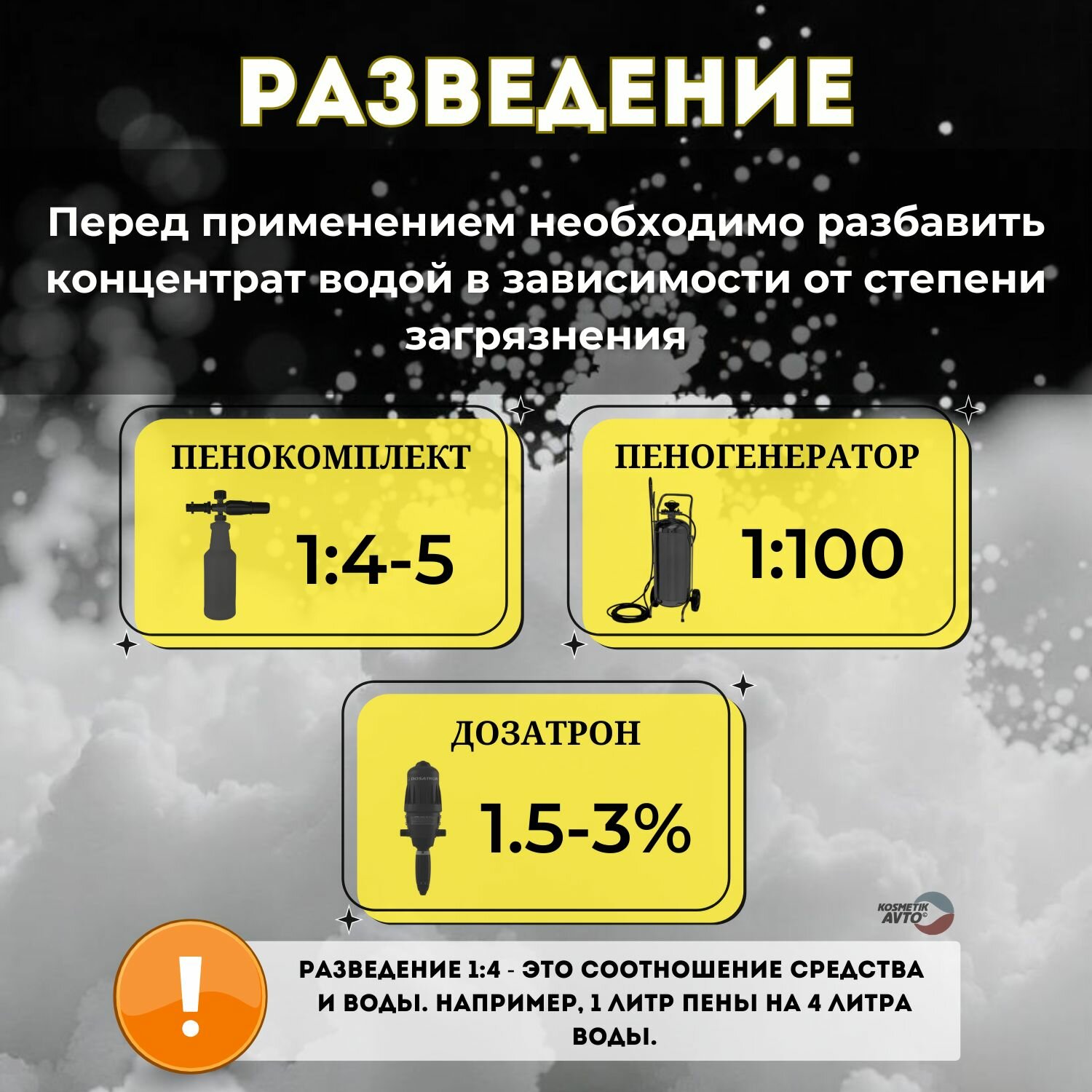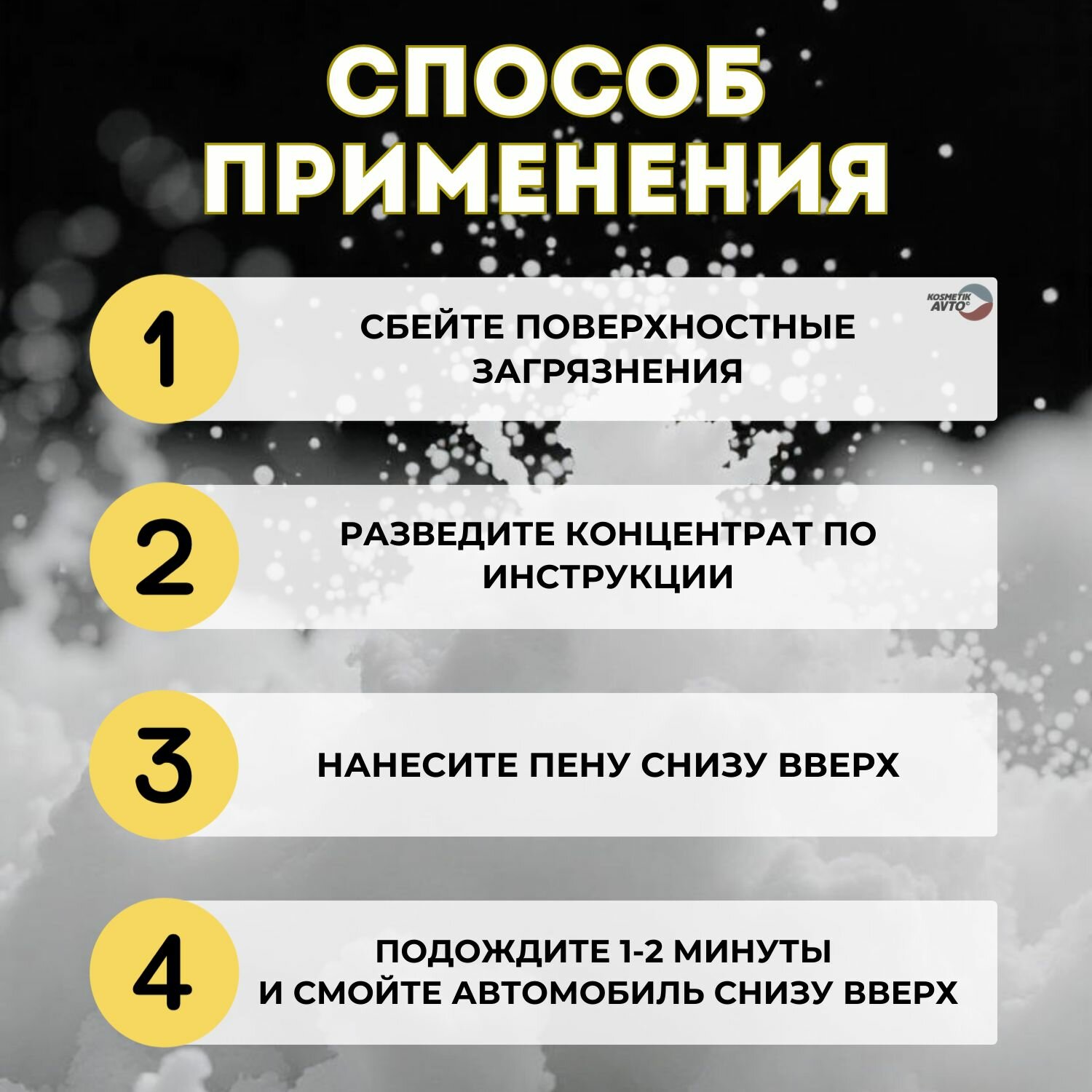 Приготовить рабочий состав разбавив с водой. Для пенокомплекта 1:4 - 1:5, для пеногенератора 1:100, в системах дозирования (дозатрон) 1,5-3% в зависимости от степени загрязнения и жесткости воды. После нанесения рабочего состава на кузов автомобиля выждать 2-3 минуты и смыть под высоким давлением при помощи АВД.