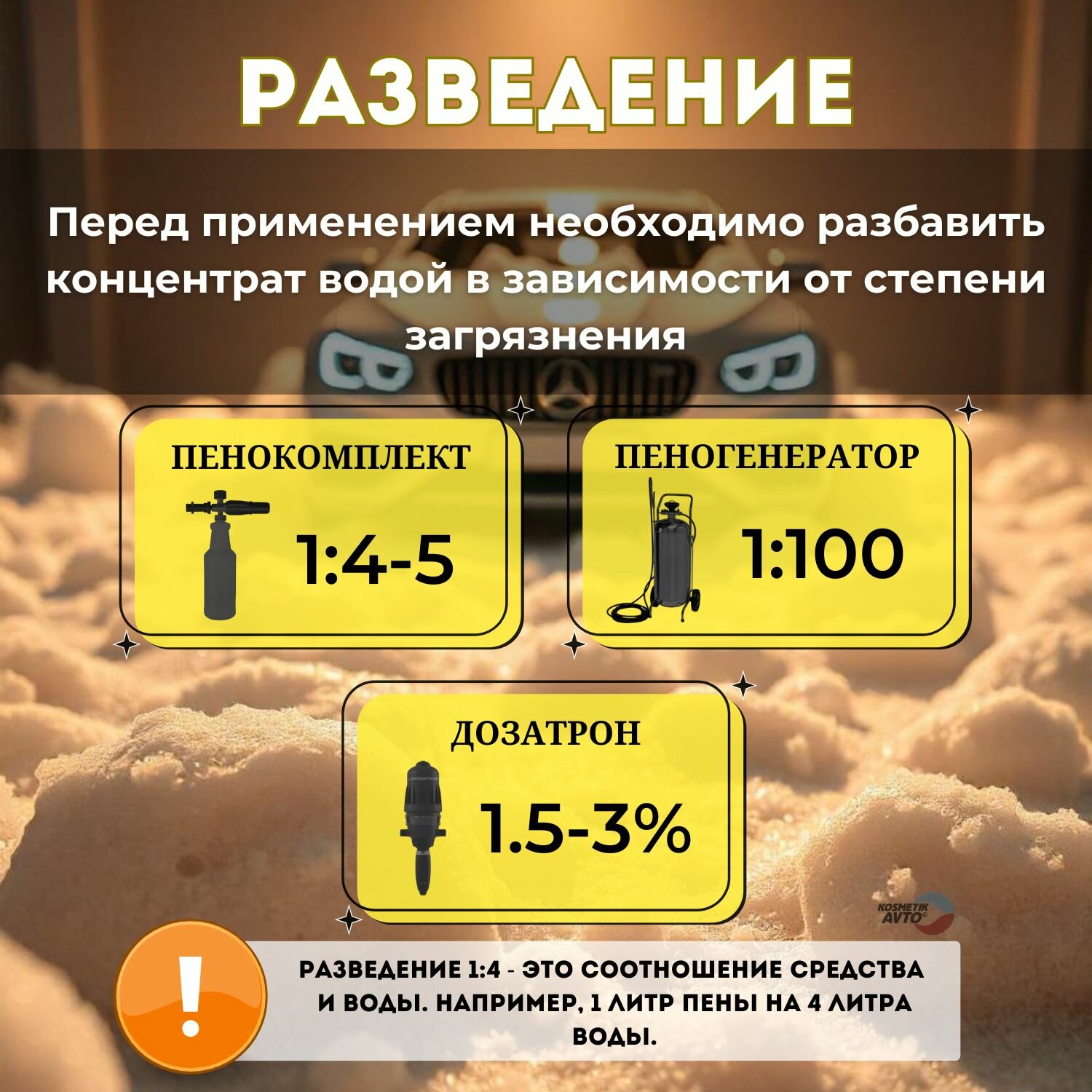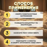 Приготовить рабочий состав разбавив с водой. Для пенокомплекта 1:4 - 1:5, для пеногенератора 1:100, в системах дозирования (дозатрон) 1,5-3% в зависимости от степени загрязнения и жесткости воды. После нанесения рабочего состава на кузов автомобиля выждать 2-3 минуты и смыть под высоким давлением при помощи АВД.