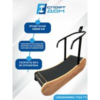 Профессиональная беговая дорожка LR-77 позволяет пользователю на 100 % контролировать процесс тренировки, обеспечивая легкий переход между различными скоростями и темпом бега • Пробег более 100 000 км обходится без единой замены бегового полотна или других деталей дорожки • Простота в обслуживании • Поскольку в LR-77 нет двигателя - Вам не нужно беспокоится о ремонте или замене дорогостоящих электрических компонентов • Базовая модель LR-77 в 2-х модификациях в наличии Преимущества LR-77 для спортсменов 1. Изогнутое беговое полотно позволяет равномерно распределять нагрузку на коленный сустав и голеностоп, применять взрывное ускорение без вреда для суставов 2. Пятимиллиметровая вспененная резина, используемая на ламелях создает эффект бега по песку с устойчивостью бега по асфальту. Нет необходимости в применении специализированной обуви для бега 3. Устойчивость бегового полотна увеличенной ширины 580 мм обеспечивается за счет установки дополнительной центральной деки 4. Усилие, прилагаемое для перемещения полотна беговой дорожки, соизмеримо с усилием при беге «в горку», контролируется за счет смещения тела спортсмена по отношению к изгибу полотна 5. Скорость бега не ограничена 6. Параметры бега отражаются на экране (скорость, дистанция, время, пульс, калории) Преимущества LR-77 для спортивного клуба 1. Российское производство. Гарантия 1 год 2. Пробег более 100 000 км без замены бегового полотна 3. Нет электрических приборов или механизмов, требующих обслуживания, подключения к сети 4. Прибор контроля параметров запитывается двумя батарейками ААА 5. Не требует специализированного обслуживания 6. Возможно постгарантийное обслуживание (все механические детали собственного производства и не зависят от зарубежных поставок) 7. Для придания элитарности беговой дорожке возможно изготовление боковых панелей из благородных сортов древесины (орех, ясень, дуб). В исходной комплектации панели изготовлены из ламинированного, влагостойкого МДФ 8. Окраска металлических поверхностей – порошковое окрашивание. Базовый цвет черный. Возможны другие цвета по согласованию 9. Ручка обтянута термоусадочной резиной. По желанию заказчика производим порошковое окрашивание Характеристики LR-77 • Профессиональная беговая дорожка • Механическая с изогнутым беговым полотном • Максимальный вес пользователя 150 кг • Вес тренажера 170 кг • Длина 1800 мм, ширина 700 мм, высота 1550 мм • Ширина бегового полотна 580 мм, длина 1650 мм • Толщина ломель 26 мм • Уровень шума средний • Скорость не ограничена • Измерение параметров: время, скорость, дистанция, пульс, калории.