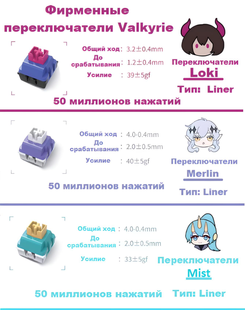 | Комплектация | Щётка для чистки, 3 фирменных переключателя, приспособление для смены клавиш |