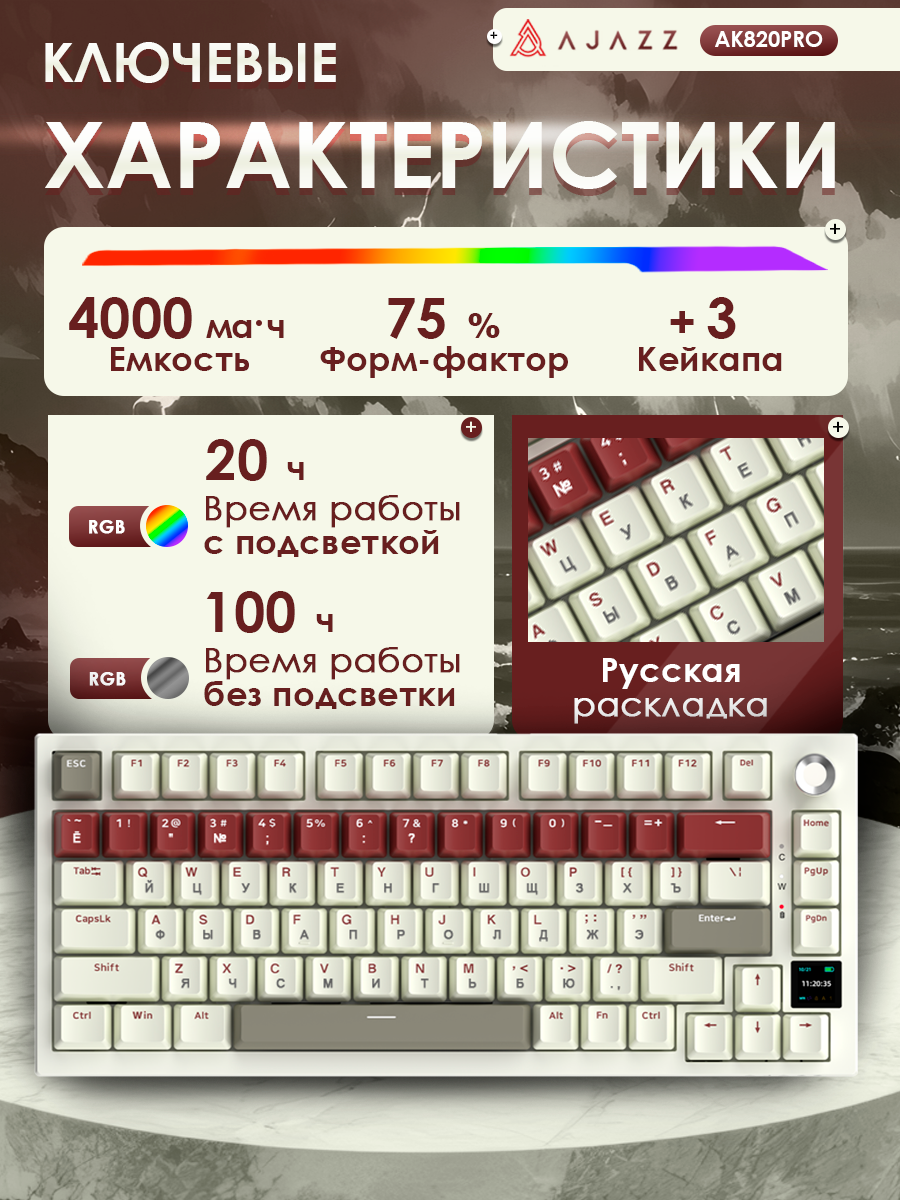 Одной из ключевых особенностей клавиатуры AJAZZ AK820 PRO является эргономичный энкодер, который обеспечивает мгновенный доступ к функциям регулировки громкости, смены языка, цвета и яркости освещения RGB подсветки. Русская раскладка позволит легко использовать клавиатуру на родном языке, что особенно важно для геймеров, играющих в русскоязычные версии видеоигр.