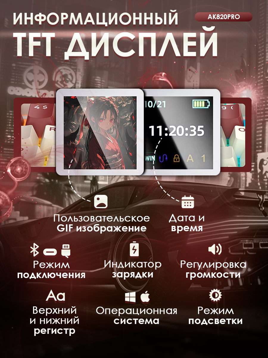 Представьте, как классно было бы не только играть за героя вашей любимой игры, но и иметь возможность поставить на экран вашей клавиатуры любое GIF изображение с вашим любимым персонажем. AJAZZ AK820 PRO предоставляет такую возможность с помощью усовершенствованного TFT дисплея последнего поколения. Экран также обладает информационной функцией. Дисплей показывает дату и время, способ подключения, уровень громкости, индикатор заряда, операционную систему, выбранный регистр и режим подсветки RGB.