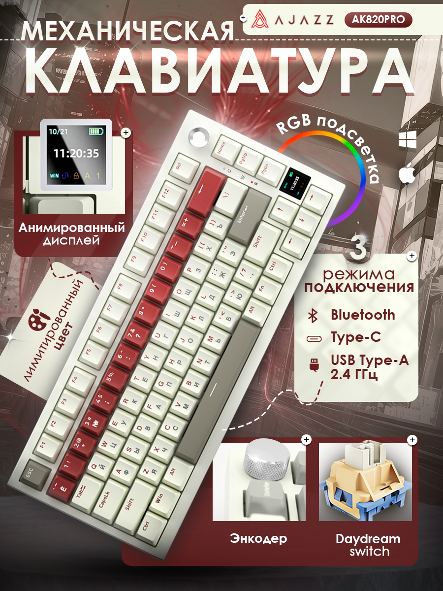 AJAZZ AK820 PRO совместима с операционными системами Windows и MacOS. Для подключения механической клавиатуры к компьютеру воспользуйтесь Bluetooth соединением, входящим в комплект кабелем USB Type-C или WiFi адаптером USB 2.4 ГГц, расположенным на обратной стороне клавиатуры. Вы также можете использовать пуллер для замены свитчей и кейкапов клавиатуры.