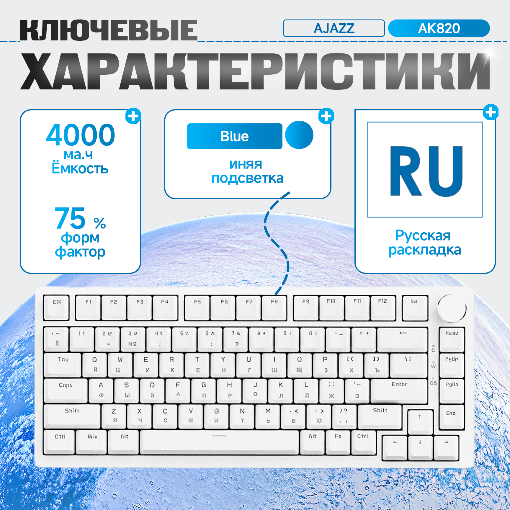 Механическая игровая клавиатура AJAZZ AK820 (синяя подсветка) Русская раскладка, Blue Switch, белый: сравнение цен, характеристики, фото, актуальное наличие и цены.