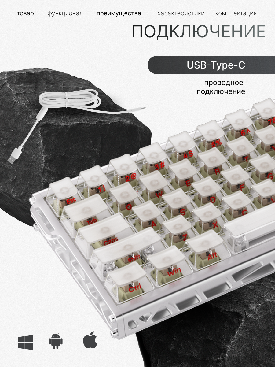 | Комплектация | руководство по эксплуатации, 4 сменных переключателя, один провод USB type C, один инструмент съемник (пуллер) для клавиш, пластиковый кожух для защиты от пыли |