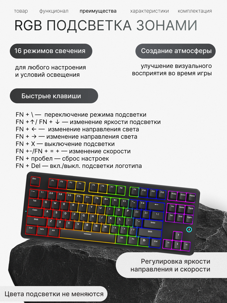 | Подсветка | зональная настройка подсветки клавиш, нет, подсветка клавиш |