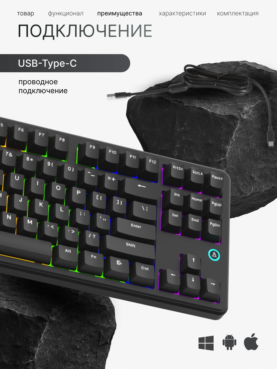 | Комплектация | руководство по эксплуатации, 4 сменных переключателя, один провод USB type C, один инструмент съемник (пуллер) для клавиш, пластиковый кожух для защиты от пыли |