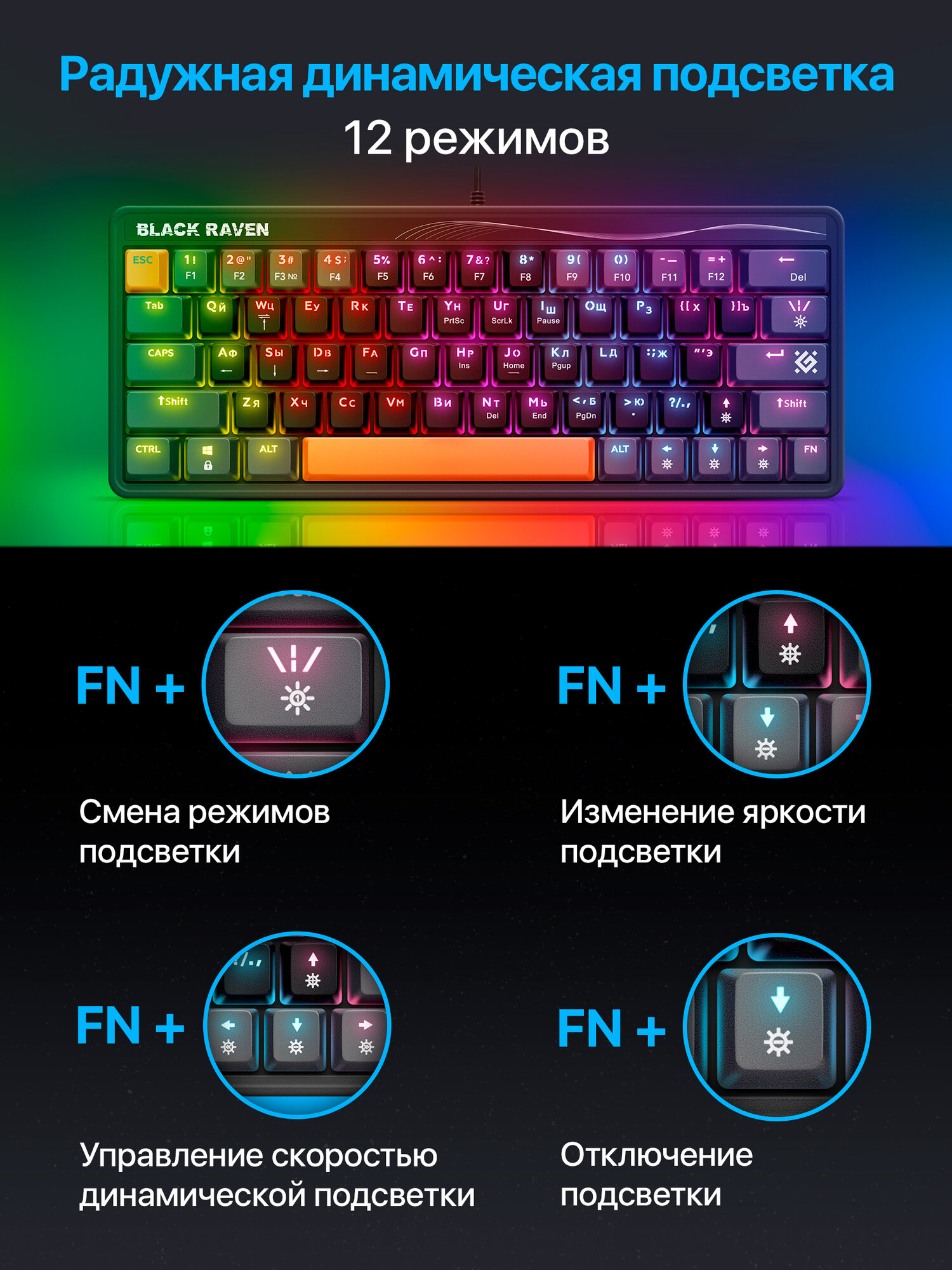 12 режимов подсветки - Для смены режима подсветки используйте комбинацию клавиш "FN+\|/"