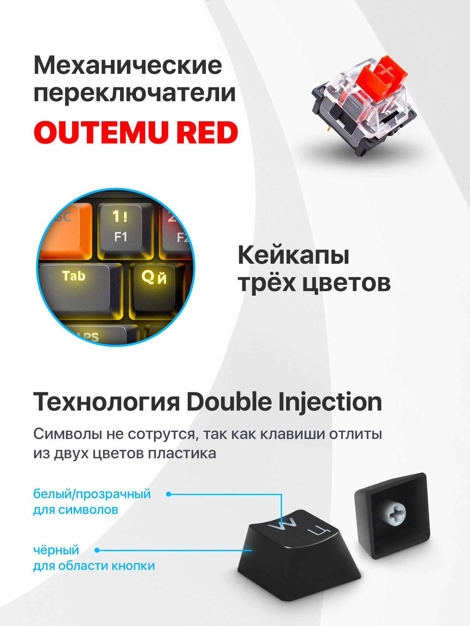 Технология Double injection - Символы не сотрутся, так как клавиши отлиты из двух цветов пластика: черный для области кнопки и белый/прозрачный для символов