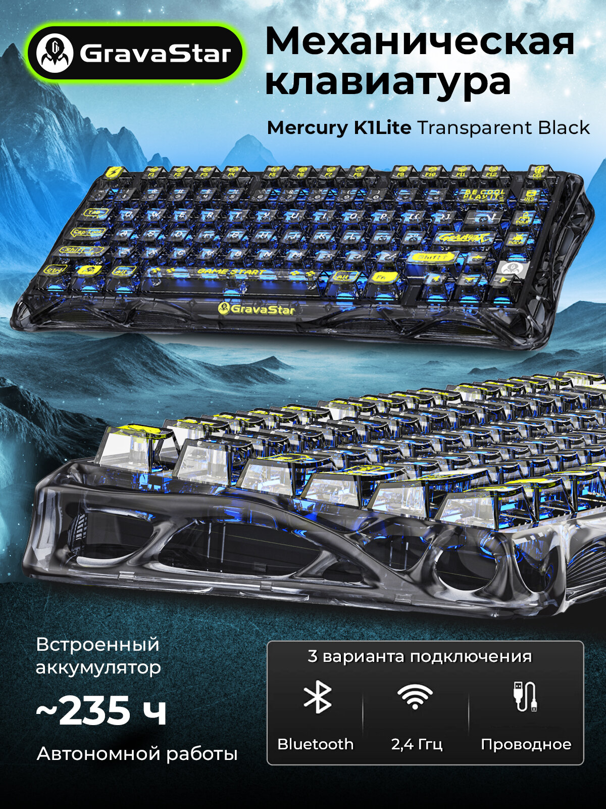 Купить Клавиатура Gravastar Mercury K1 Lite Transparent Black, игровая, 3 вида подсветки: Bluetooth, 2,4 ГГц, USB с доставкой по всей России. Клавиатура Gravastar Mercury K1 Lite Transparent Black, игровая, 3 вида подсветки: Bluetooth, 2,4 ГГц, USB: сравнение цен, характеристики, фото, актуальное наличие и цены.