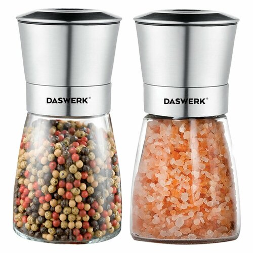Набор механических мельниц для специй с высокопрочными керамическими жерновами идеально впишется в любой интерьер и не будет занимать много места.\Набор механических мельница для специй с высокопрочными керамическими жерновами идеально впишется в любой интерьер и не будет занимать много места. Мельницы снабжены регулировкой помола (крупный, средний и мелкий помол) и подходят для специй, морской соли, перца и различных трав. Ручные мельницы помогут сделать Ваше блюдо незабываемым.\Тип товара: набор механических мельниц. Материал корпуса: пластик, сталь. Материал колбы: стекло. Количество в комплекте: 2 шт. Работает от батареек: нет. Количество уровней помола: 4. Вес: 0.5 кг Бренд - DASWERK. Производитель - Китай. Артикул - 456628. Штрихкод - 4606224419350