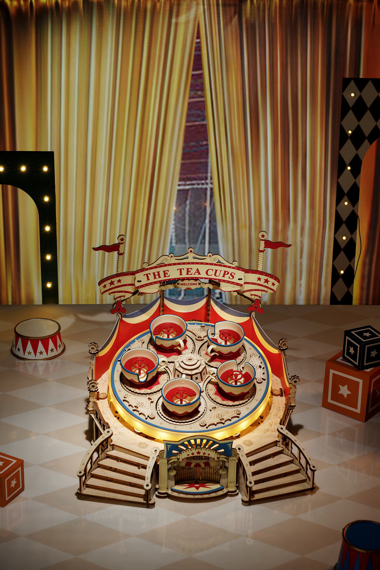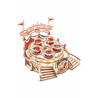 Механический конструктор Robotime Tilt-A-Whirl вдохновлен ретро парком развлечений. Благодаря встроенному механизму, после нажатия кнопки заиграет музыка, зажгутся огни и сиденья-чашки начнут двигаться в танце. Создайте эту изысканную модель своими руками! Откройте упаковку и достаньте по очереди деревянные детали, инструкцию и другие аксессуары. Соберите конструктор по инструкции.