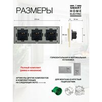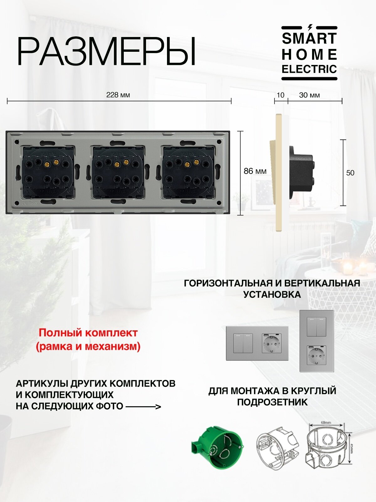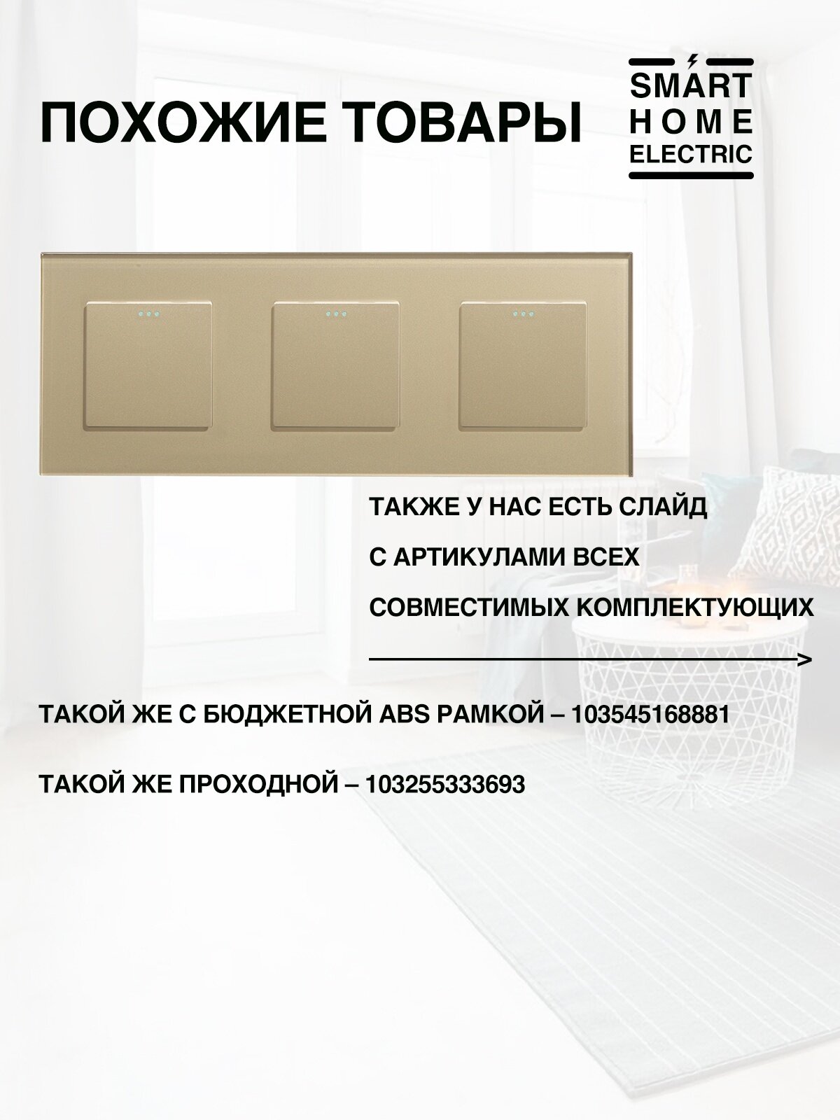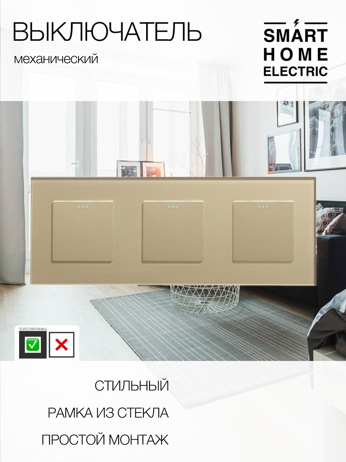 Тройной механический выключатель на три клавиши в стеклянной рамке золотого цвета. Надежный и недорогой выключатель в современном дизайне. Это готовый комплект для установки, докупать ничего не нужно. Устанавливается в тройной стандартный круглый подрозетник. – Рамка из натурального стекла 228 на 86 мм. Выпирает от стены всего на 10 мм. Выглядит стильно, легко вписывается в любой интерьер. – Блок механического выключателя . На каждой клавише есть флуоресцентные точки для лучшей видимости выключателя в темноте. Все остальные розетки и выключатели есть в наличии в нашем магазине