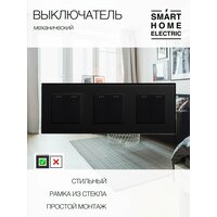 Тройной механический выключатель на шесть клавиш в стеклянной рамке черного цвета. Надежный и недорогой выключатель в современном дизайне. Это готовый комплект для установки, докупать ничего не нужно. Устанавливается в тройной стандартный круглый подрозетник. – Рамка из натурального стекла 228 на 86 мм. Выпирает от стены всего на 10 мм. Выглядит стильно, легко вписывается в любой интерьер. – Блок механического выключателя . На каждой клавише есть флуоресцентные точки для лучшей видимости выключателя в темноте. Все остальные розетки и выключатели есть в наличии в нашем магазине