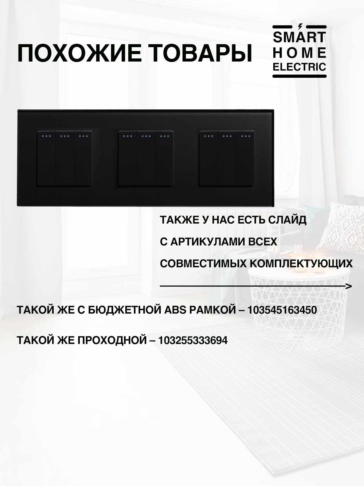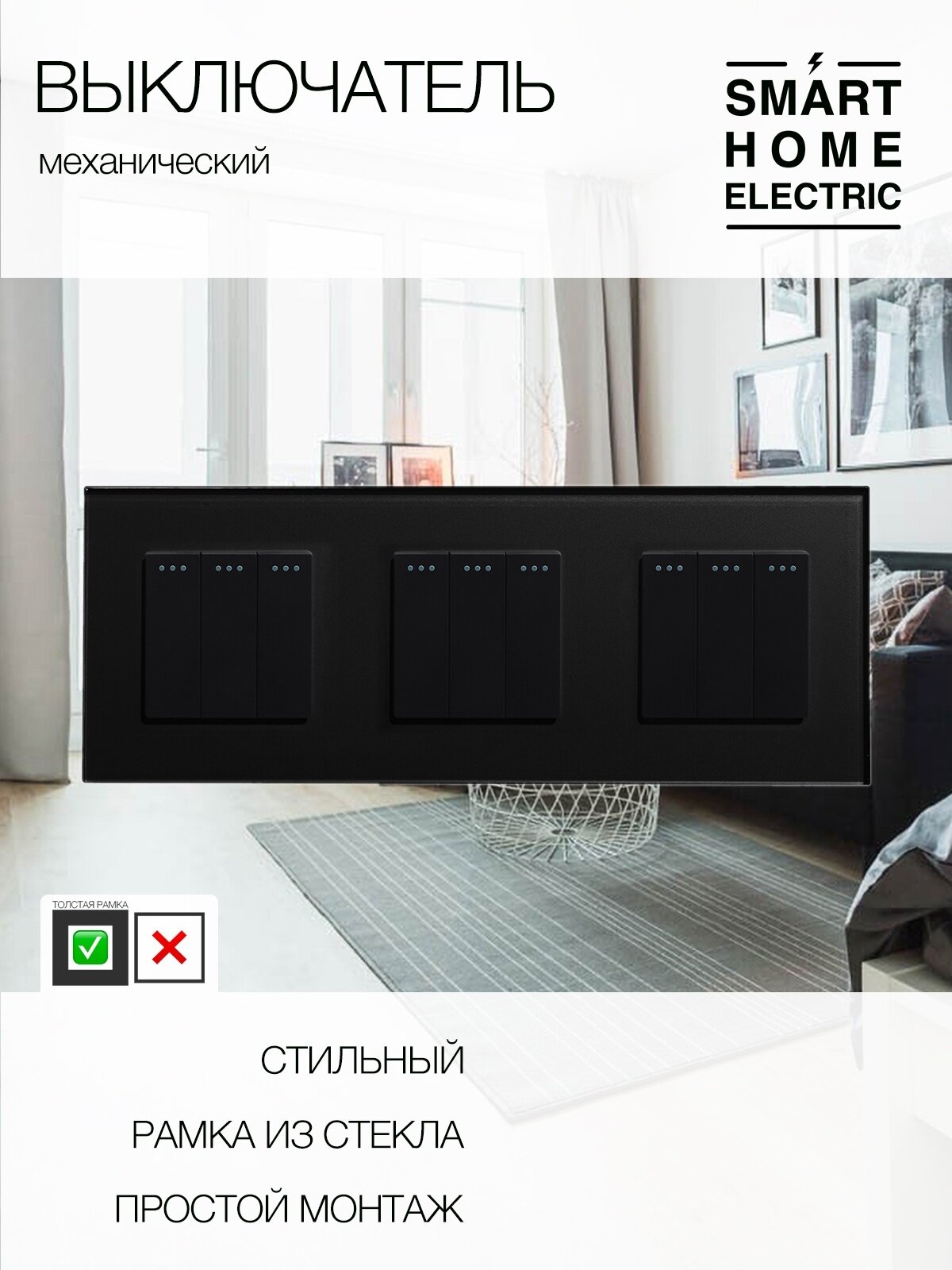 Тройной механический выключатель на девять клавиш в стеклянной рамке черного цвета. Надежный и недорогой выключатель в современном дизайне. Это готовый комплект для установки, докупать ничего не нужно. Устанавливается в тройной стандартный круглый подрозетник. – Рамка из натурального стекла 228 на 86 мм. Выпирает от стены всего на 10 мм. Выглядит стильно, легко вписывается в любой интерьер. – Блок механического выключателя . На каждой клавише есть флуоресцентные точки для лучшей видимости выключателя в темноте. Все остальные розетки и выключатели есть в наличии в нашем магазине