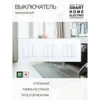 Тройной механический выключатель на девять клавиш в стеклянной рамке белого цвета. Надежный и недорогой выключатель в современном дизайне. Это готовый комплект для установки, докупать ничего не нужно. Устанавливается в тройной стандартный круглый подрозетник. – Рамка из натурального стекла 228 на 86 мм. Выпирает от стены всего на 10 мм. Выглядит стильно, легко вписывается в любой интерьер. – Блок механического выключателя . На каждой клавише есть флуоресцентные точки для лучшей видимости выключателя в темноте. Все остальные розетки и выключатели есть в наличии в нашем магазине