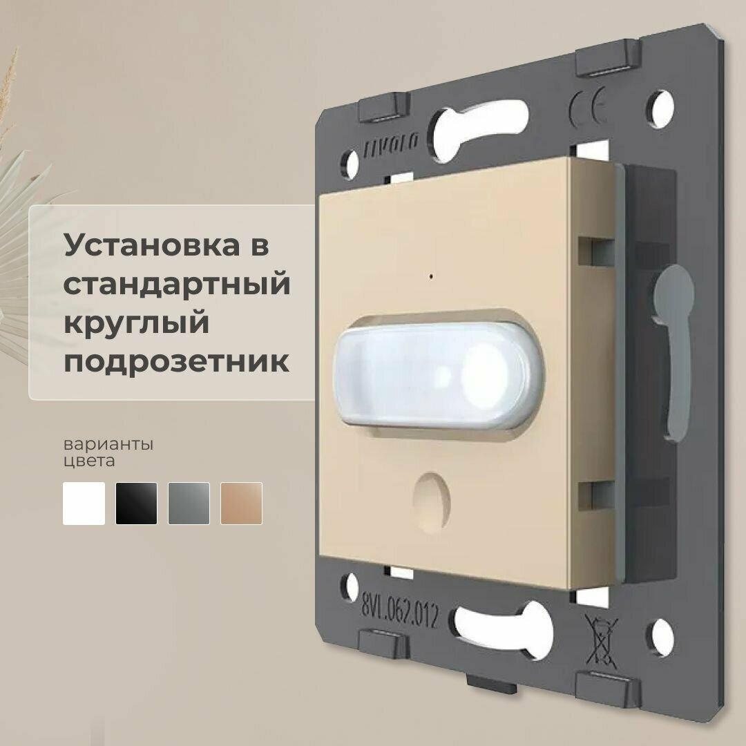 Механизм сенсорного выключателя Livolo с датчиком движения золотой для управления одной линией нагрузки (ВКЛ/выкл). Датчик движения имеет 3 настройки: Время работы срабатывания, радиус чувствительности, уровень освещения для срабатывания. Есть сенсорная кнопка для ручного управления освещением. Для переключения между режимами зажмите клавишу до изменения цвета подсветки. Механизм устанавливается совместно с рамками Livolo для сенсорных выключателей. Чувствительный сенсор, моментальное включение. При переключении издаётся лёгкий щелчок. Подсветка клавиш светится синим при выключенном свете, красным при включённом. Механизм устанавливается в стандартный круглый подрозетник. Переделывать проводку не нужно (только фазный провод, без нуля). Работает со всеми типами ламп. Максимальная нагрузка 1000 Ватт на клавишу. Для корректной работы с лампами мощностью менее 5 Ватт может потребоваться адаптер для маломощных ламп.
